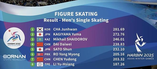 韩国选手夺金!亚冬会花滑男单:戴大卫第4陈昱东第7!